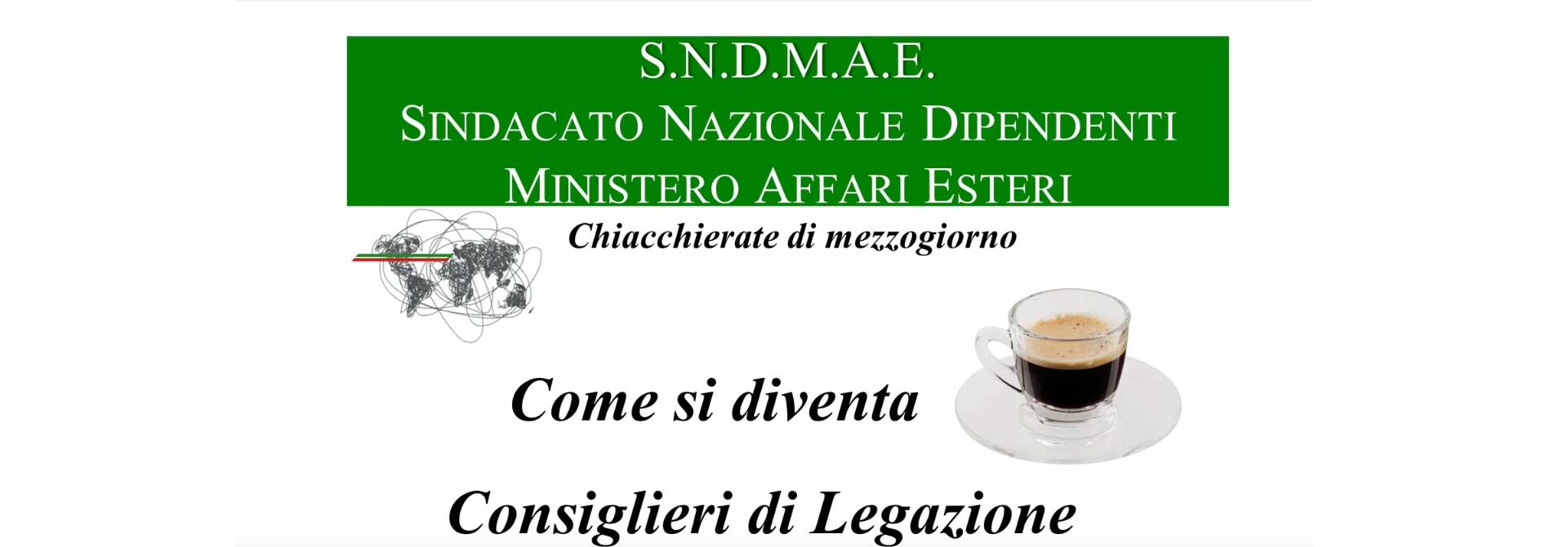 Il S.N.D.M.A.E. – Sindacato Nazionale Dipendenti del Ministero Affari Esteri – è costituito in Roma, presso il Ministero degli Affari Esteri e riunisce, in un’associazione assolutamente apolitica e apartitica, circa 750 associati, residenti a Roma e all’estero, che rinnovano, ogni anno elettivamente, i propri organi direttivi.